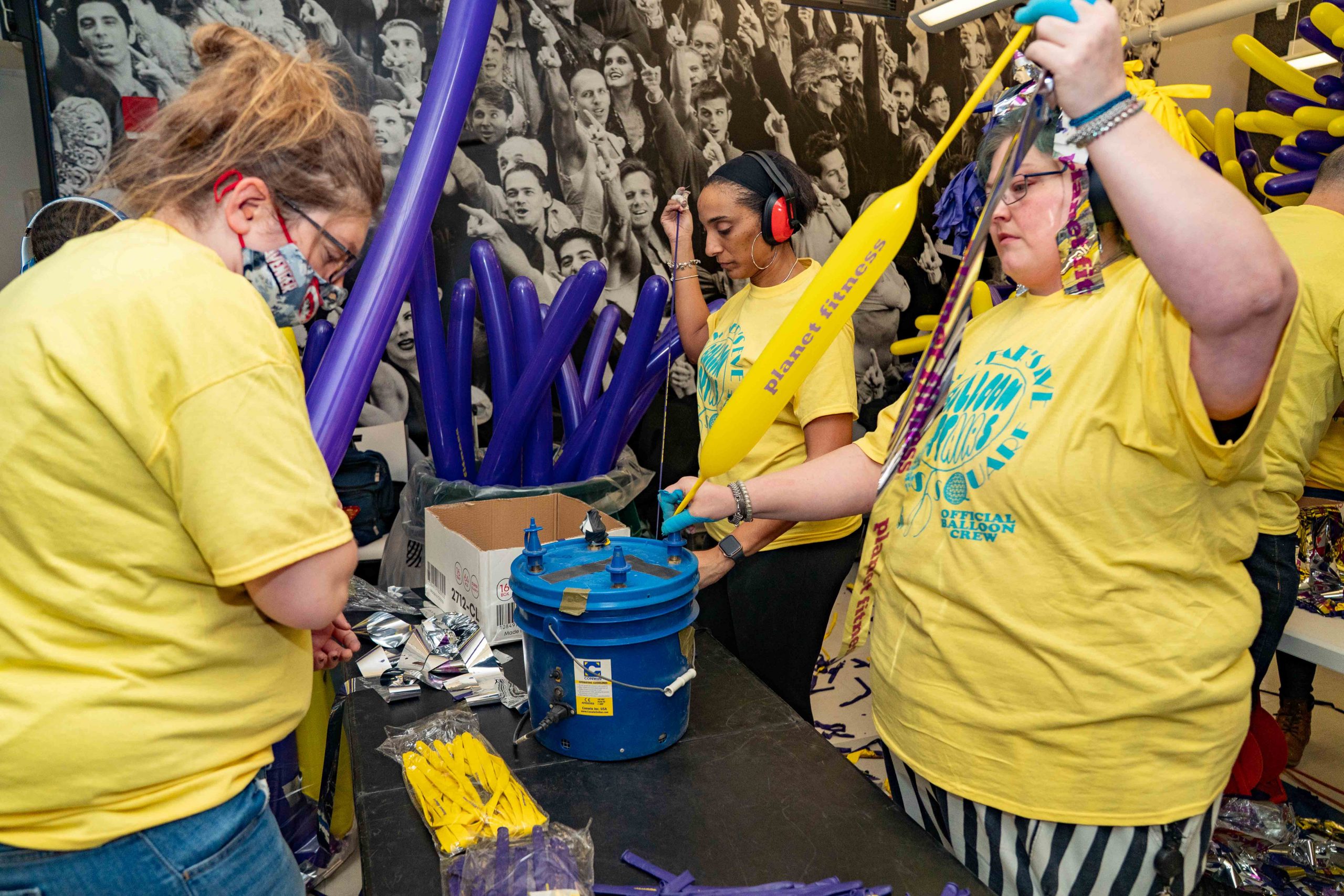 Workers from Balloon Affairs prepare 25,000 Planet Fitness balloons to hand out to revelers in Times Square on December 31, 2025. The balloons, with silver streamers attached, will produce a shimmering sea of purple and yellow on New Year’s Eve. Balloon Affairs is celebrating 32 years providing balloons for the NYE celebration.